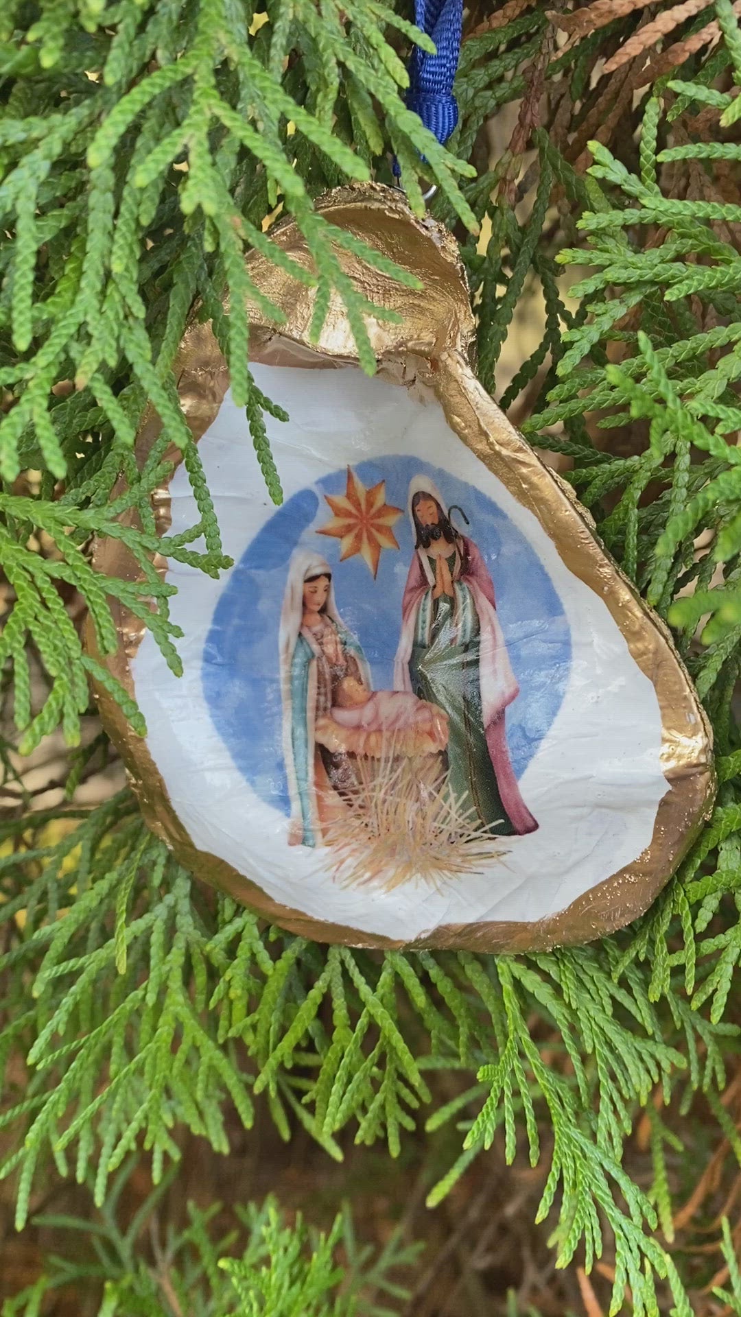 This Christmas manger scene ornament is made from a real oyster shell. These are one of a kind and each one is slightly different. The back is entirely gold leaf and the front edges are gold leaf. The ornament attaches with a royal blue grosgrain ribbon. Make this ornament part of your handmade collection!