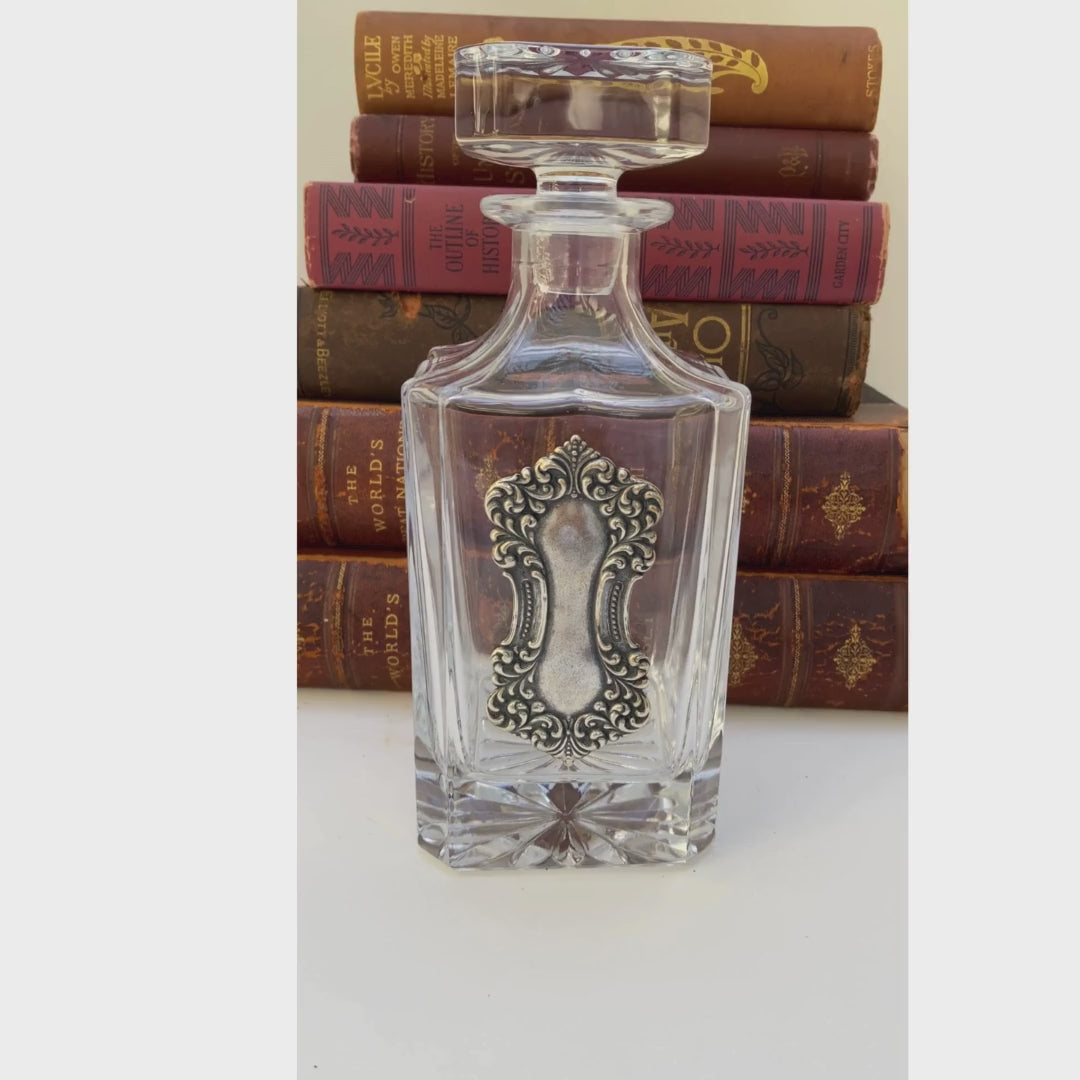 This decanter features a large vintage silver medallion. This elegant decanter is handcrafted of lead-free glass. The large silver medallion embellishment evokes luxury. The decanter holds 25 ounces and measures 9" x 4" x 4". It ships in a white gift box and is a wonderful groomsmen's gift or a gift for anyone who loves the upscale look.