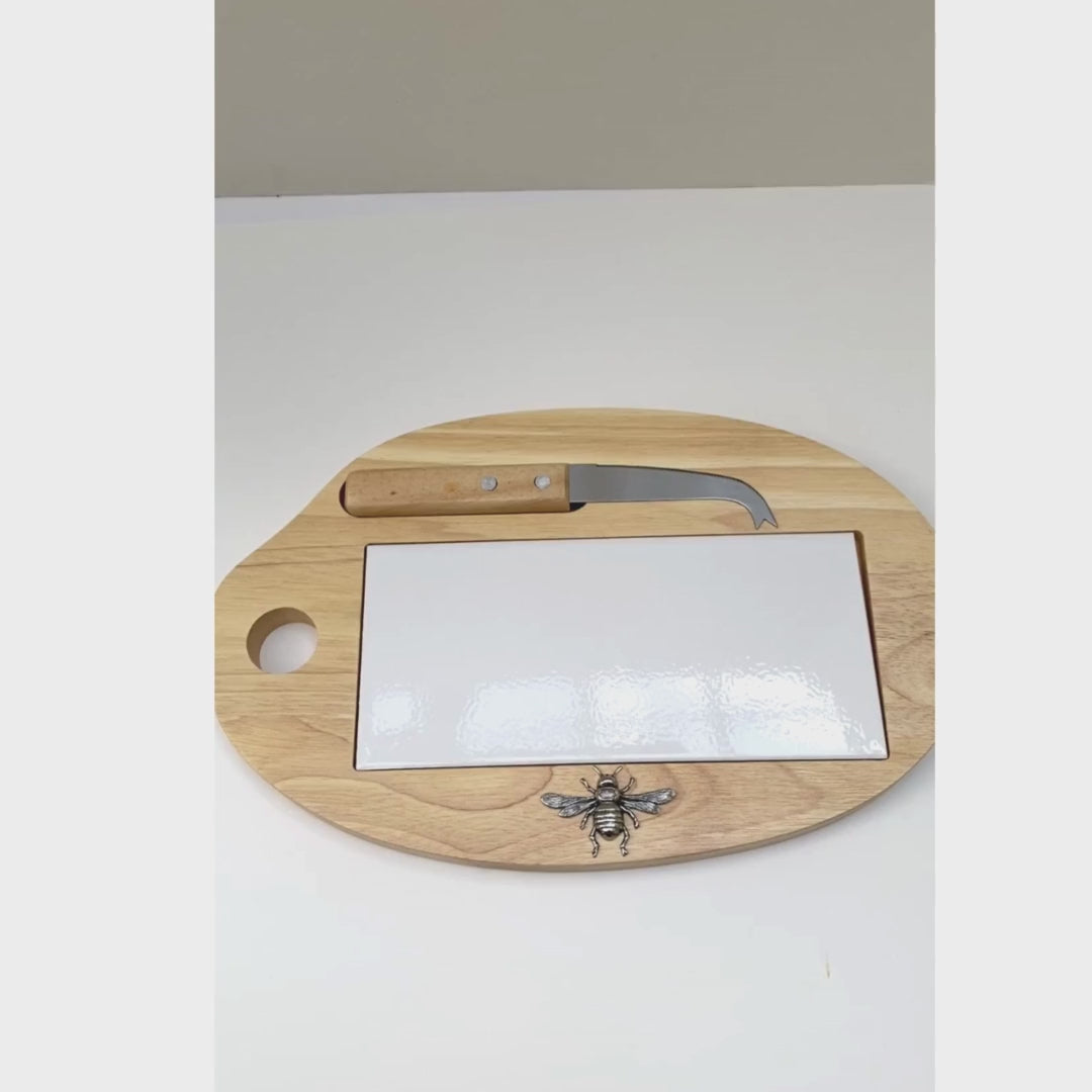 Classic Legacy's new cheese board is embellished with a large gold bee medallion. This gift is the perfect gift for a bee lover! Cheeses can be cut easily on the inset tile on this wood cheese board. The 12.75" long board includes a knife which is held in place with a magnet. The tile measures 8 3/4" long x 4" wide. Total Dimensions: 12.75" x 8.5
