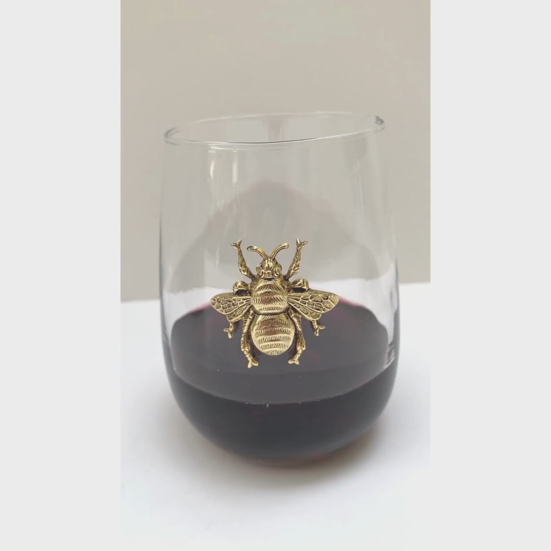 Our gold bee stemless wine glass is embellished with a gold bee medallion. This is a great gift for any bee lover. Each glass is hand-made. This stemless wine glass holds 17 oz. and should be hand washed.