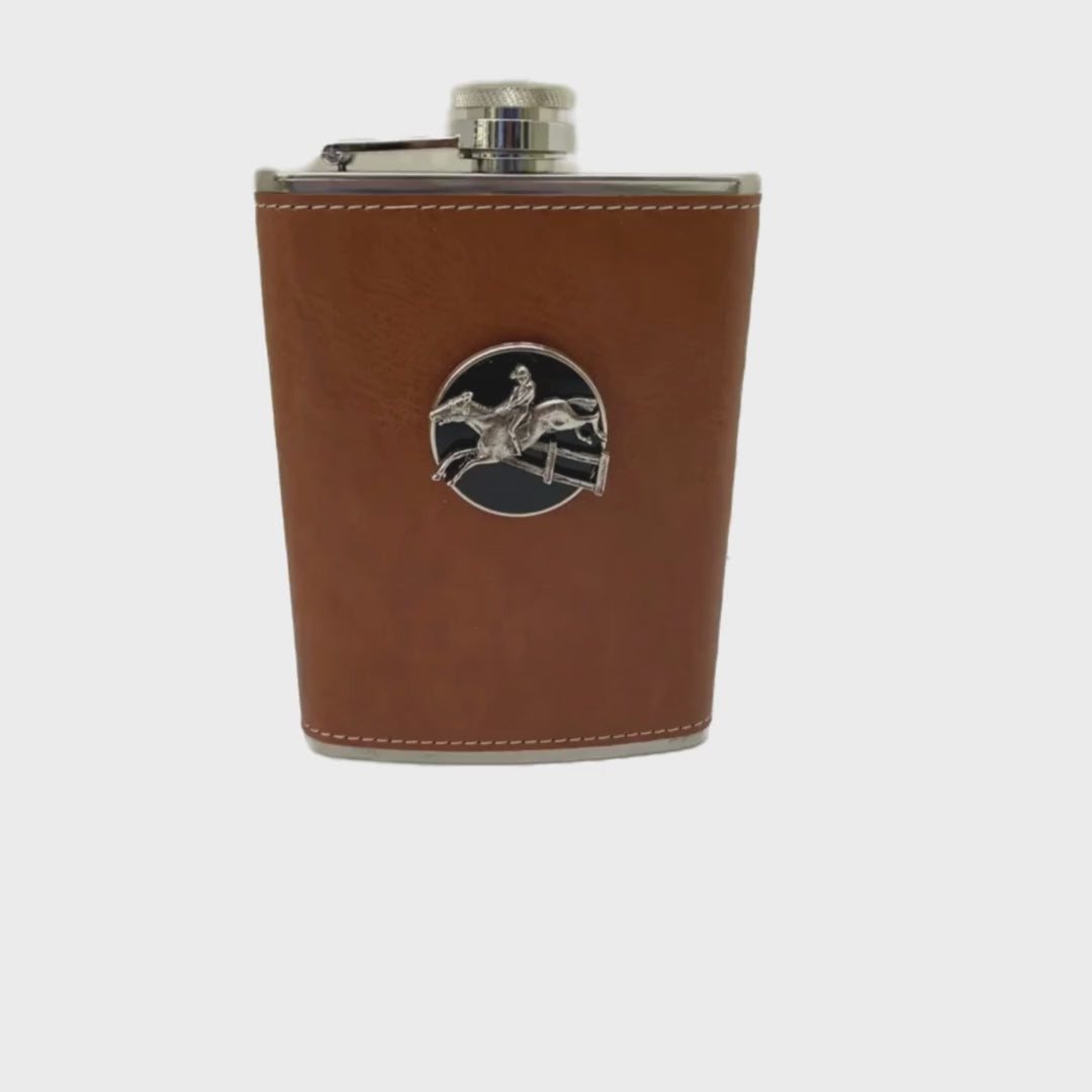 This leather flask is embellished with a silver hunter jumper equestrian horse medallion. The stainless steel flask holds 6 ounces of your favorite beverage. The flask is packaged in a white gift gift box.