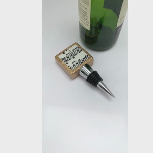 This marble wine bottle stopper features sheet music. The edges and back of the stopper are gold leaf. The Italian marble measures 1 7/8" x 3/4". Multiple suction rings give this stopper a secure seal. The bottle stopper is packaged in a shiny black gift box tied with a grosgrain ribbon. This is a great gift for any music lover