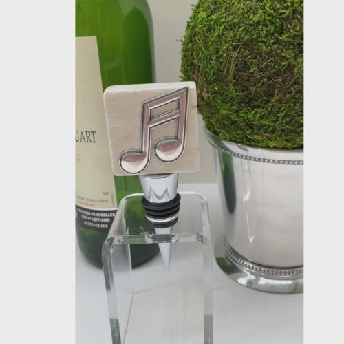 This marble wine bottle stopper features a silver notes medallion. The Italian marble measures 1 7/8" x 3/4". Multiple suction rings give this stopper a secure seal. The bottle stopper is packaged in a shiny black gift box tied with a grosgrain ribbon. This is a great gift for any music lover