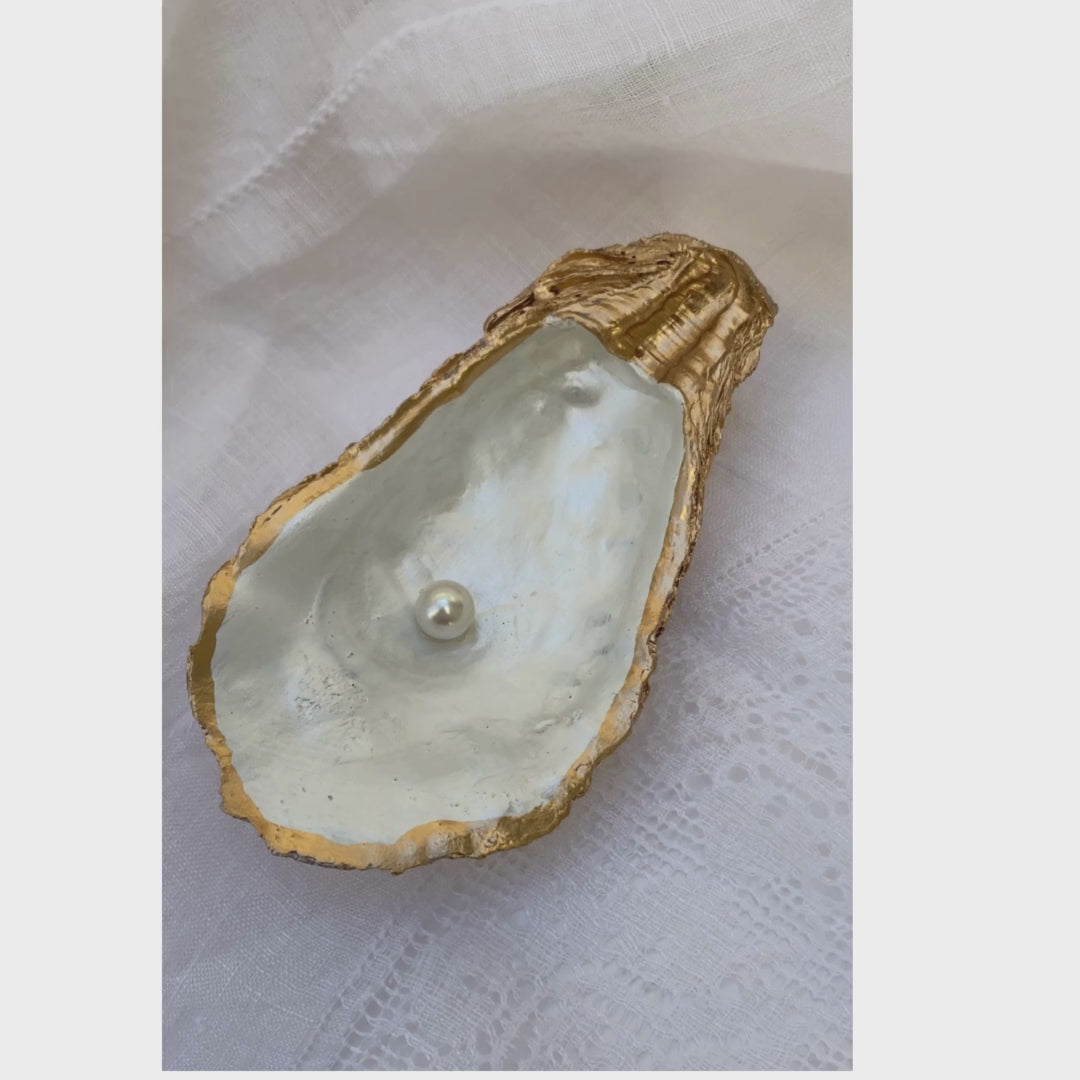 Discover a one-of-a-kind treasure with our handcrafted oyster shell art. Each genuine oyster shell, measuring approximately 5-6 inches, is meticulously decoupaged with elegant white and gold leaf, then adorned with a delicate faux pearl at its heart. The natural back of each shell is preserved, highlighting its authenticity and unique character, ensuring no two pieces are exactly alike. This exquisite piece serves as a beautiful reminder that 'You are a pearl of great price,' making it a meaningful gift for a 30th anniversary or a cherished keepsake