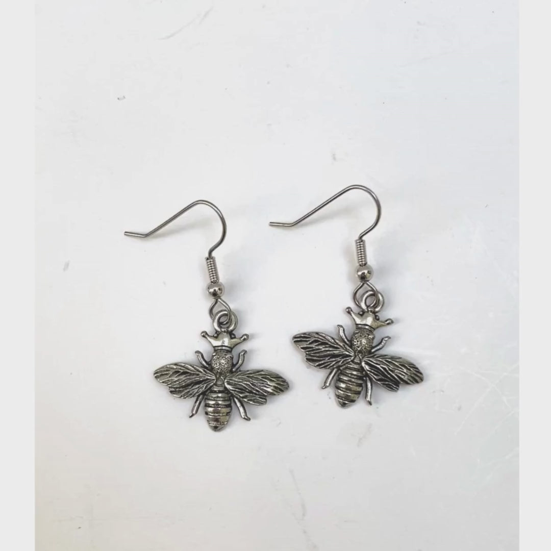 The silver queen bee earrings are silver plated and are attached with a surgical steel French ear wire. These are lightweight but large enough to make a statement. These earrings make a great gift for everyone who loves bees and nature.