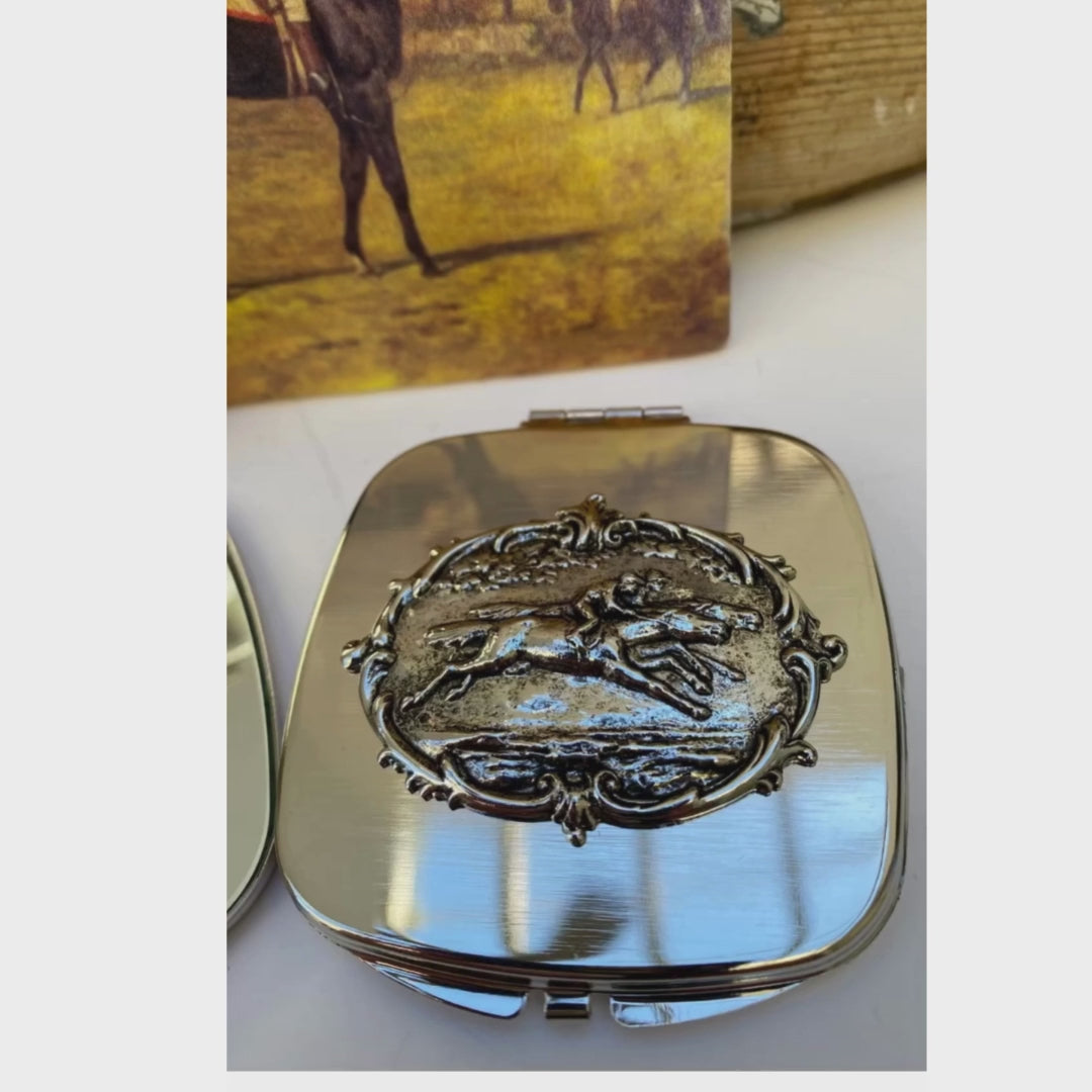 Our silver purse mirror is embellished with a vintage-inspired silver horserace theme medallion. The medallion features two horses and their jockeys. This is the perfect gift for her in the Derby and horse racing season.
