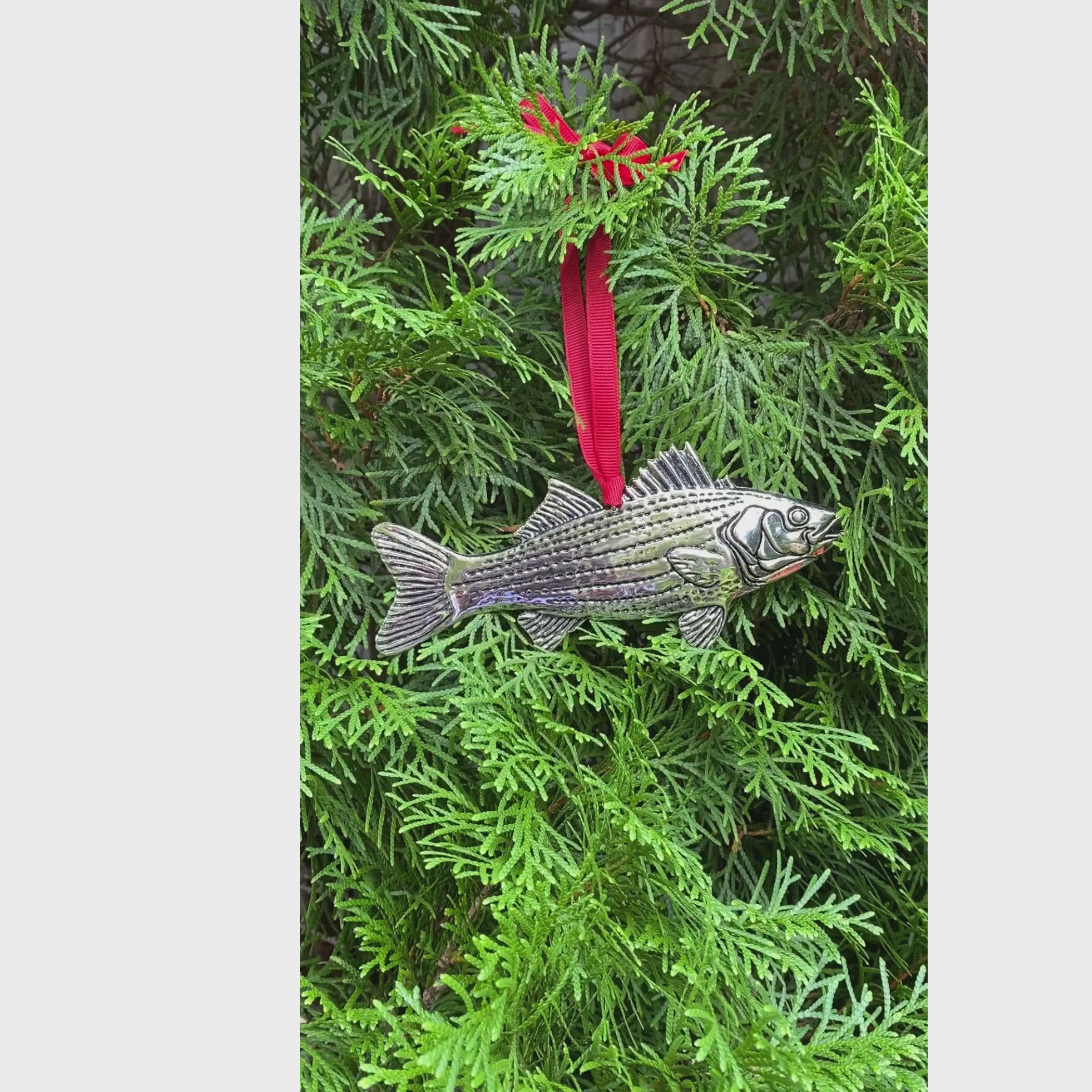 This fish Christmas Ornament makes a statement. It is handmade from steel and is silver plated. The fish is hung with a red grosgrain ribbon. It is a great gift for a fisherman.